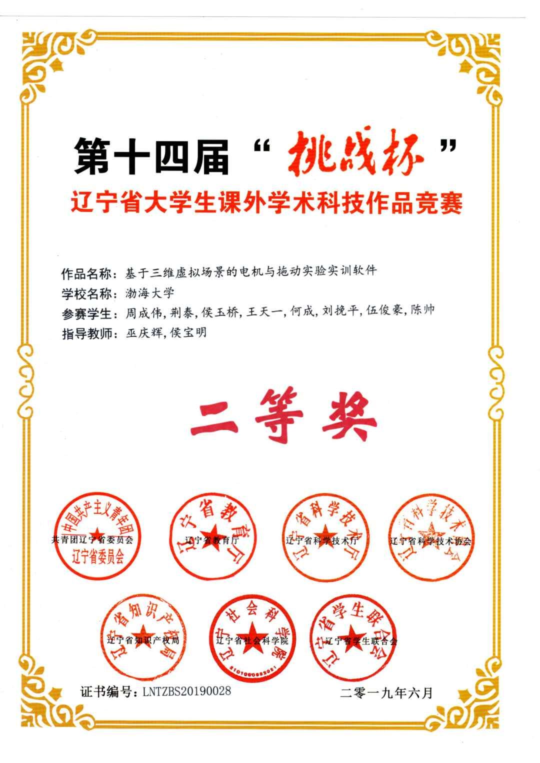 第十四届“挑战杯”辽宁省大学生课外学术科技作品竞赛二等奖