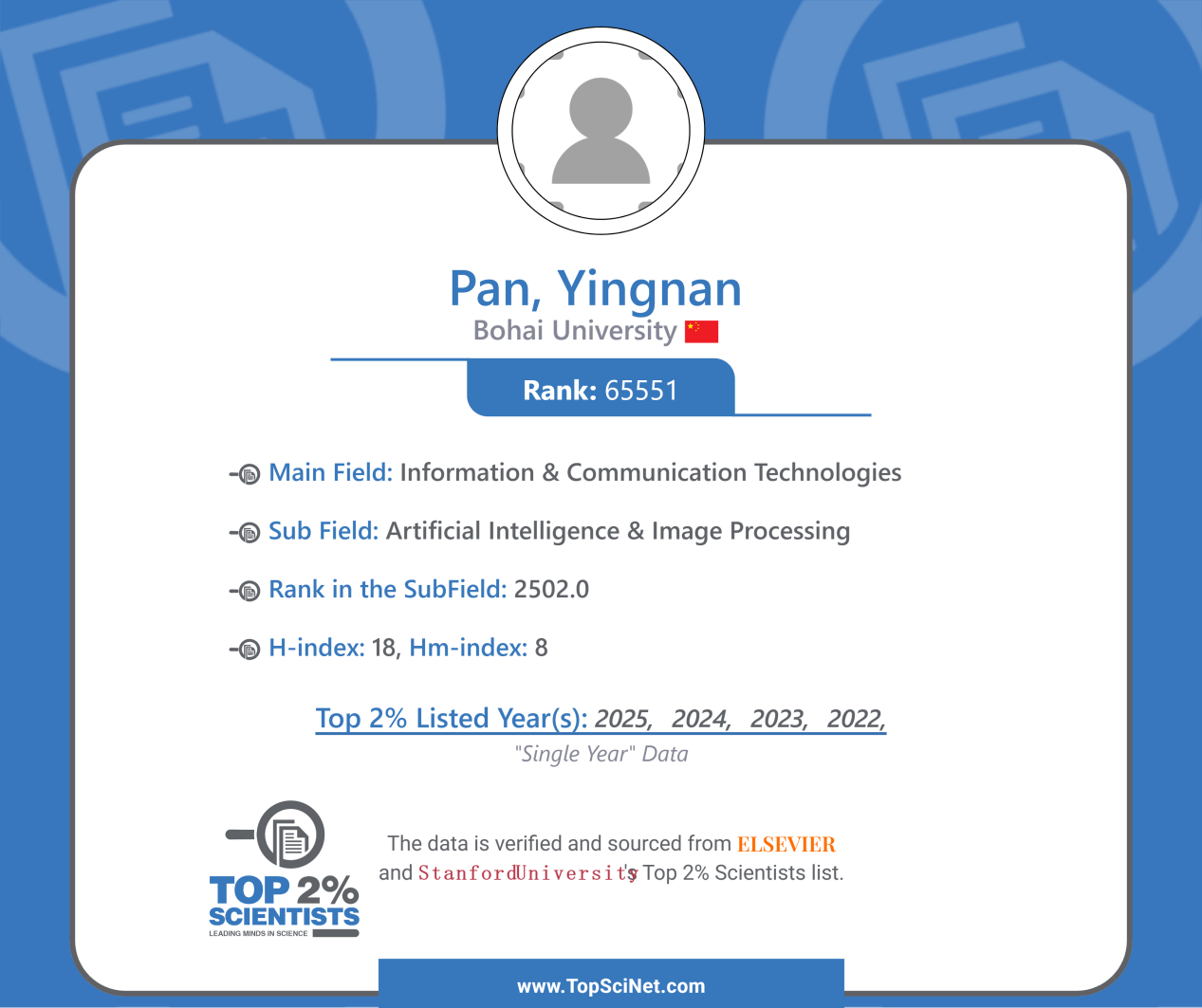 全球前2%顶尖科学家榜单基于Scopusicon数据库,由斯坦福大学John P.A.Ioannidis教授团队与Elsevier旗下Mendeley Data发布,统计的论文涵盖SSCI、SCI、EI期刊、EI会议,再以论文被引次数、h因子、hm因子等进行综合评估,根据其“生涯影响力”和“年度影响力”从近全球700万名科学家中遴选出世界排名前2%的科学家,涵盖22个领域和174个子领域。我院进入榜单的学者研究方向是前沿领域,从一定程度上反映了我院学者在相关领域具有较强的科研实力和较高的国际学术影响力。 |
