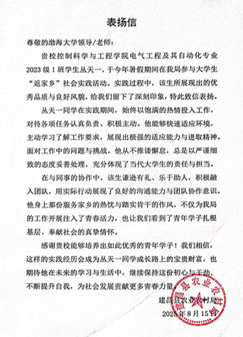 为积极响应国家号召,弘扬志愿服务精神,控制科学与工程学院学生丛天一赴建昌县农业农村局开展“返家乡”社会实践活动。实践期间,学生秉持务实作风,积极履行青年责任与担当,获得实践单位的高度认可和一致好评,充分展现新时代青年的担当精神。