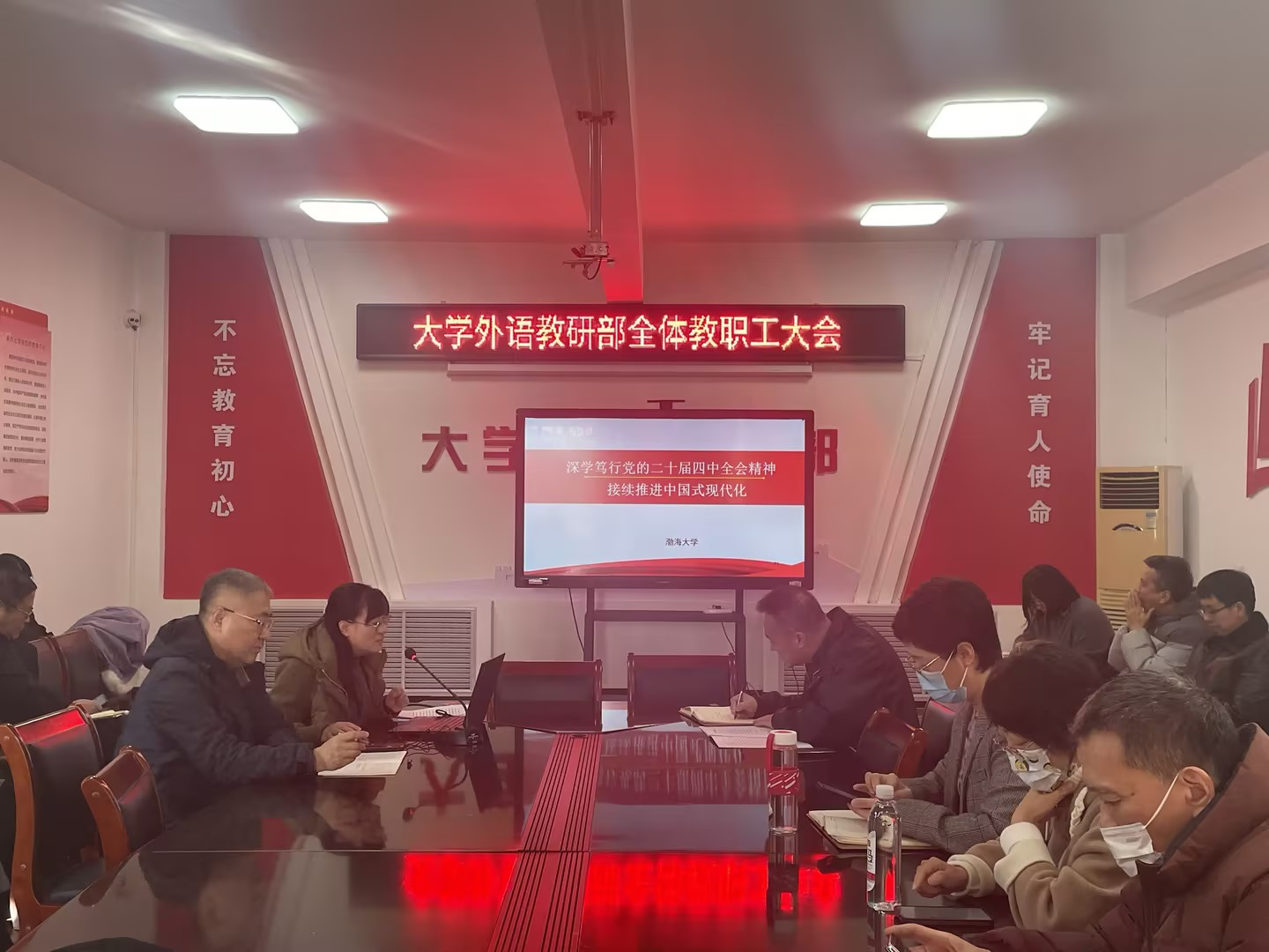 为深入学习贯彻党的二十届四中全会精神,引导全体教职工深刻领会全会重大意义和核心要义,2025年11月26日下午,大学外语教研部在敏行北楼315会议室,举行了“深学笃行党的二十届四中全会精神,接续推进中国式现代化”专题讲座。本次讲座由马克思主义学院尹燕教授担任主讲,大学外语教研部全体教职工共同聆听了此次报告。